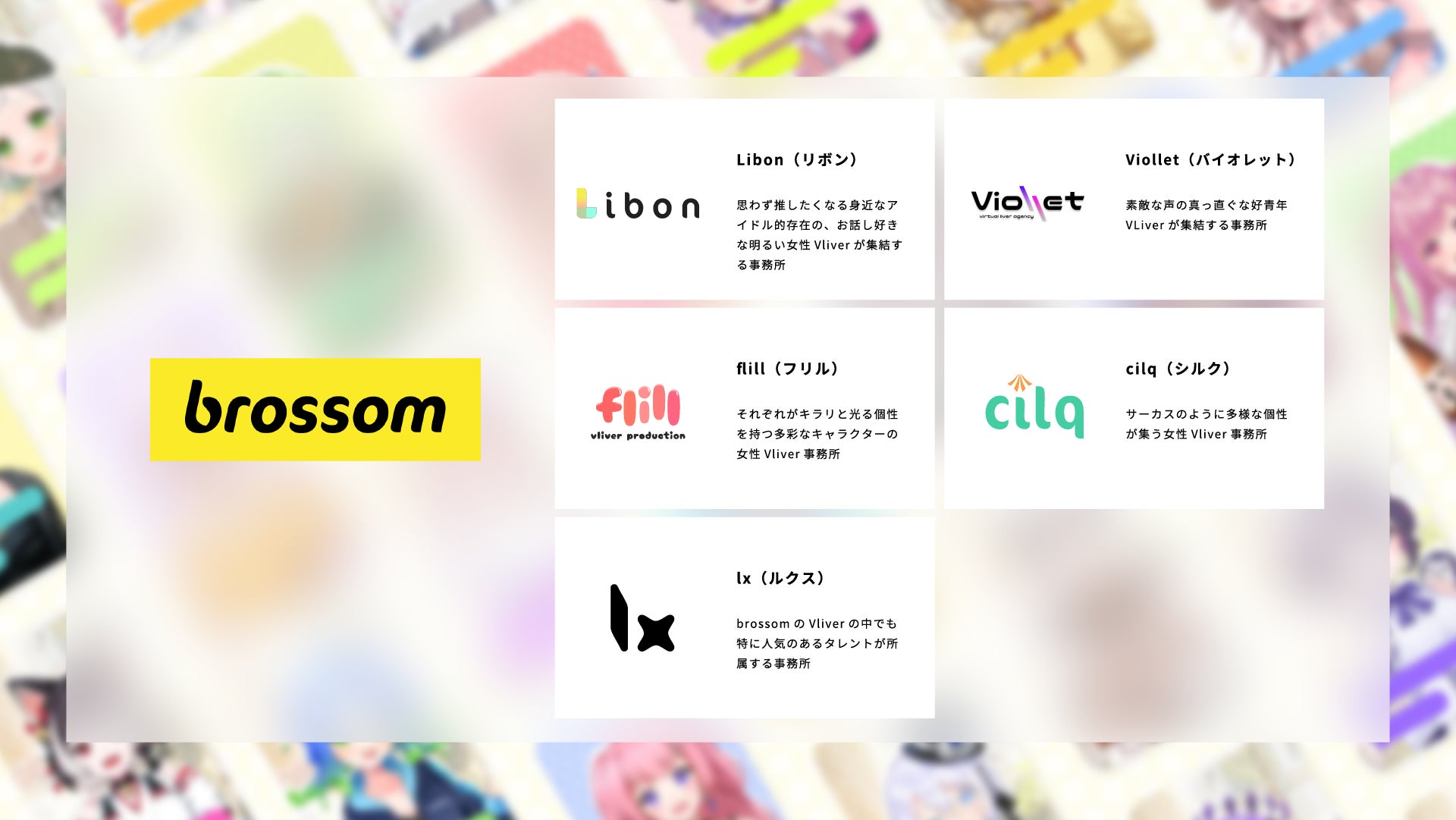 brossomは、『いつものあなたをバーチャルで誰かのスターに』というビジョンのもと、キャラクターやアバターとして活動するVLiverのプロデュースおよびマネジメントを行い、独自の個性を持つ5つのVLiverプロダクションを展開しています。